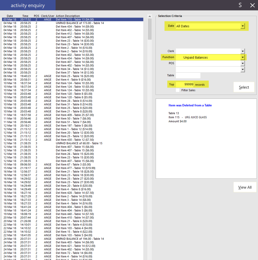 In the Activity log, use the Function = Unpaid Balances to show any times that items were deleted from a table and that a table was finished with an unpaid balance: