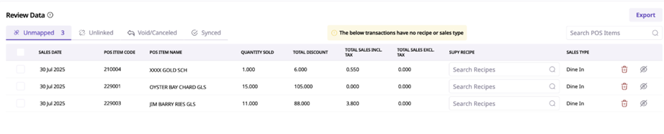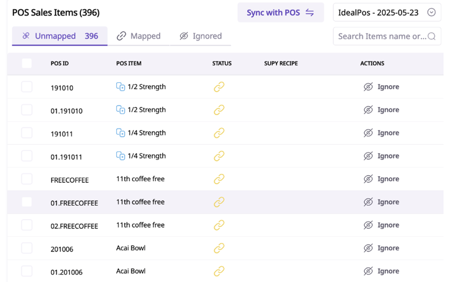 Next a POS items sync is done, POS items are mapped to their corresponding SUPY recipes