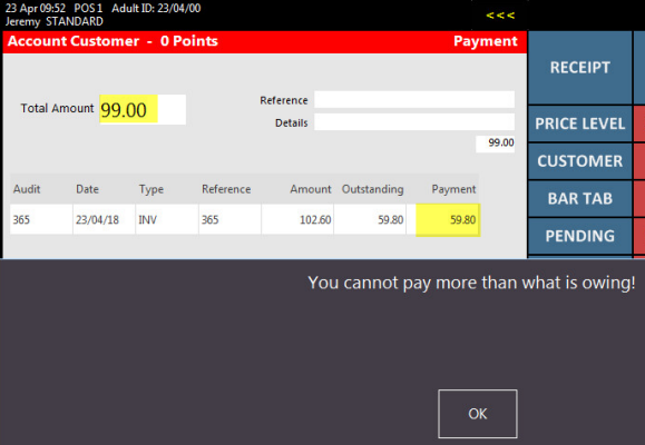 When making a Payment from the POS screen to an Account Customer, when you attempt to pay more than the total outstanding amount for current invoices, the following message displays: