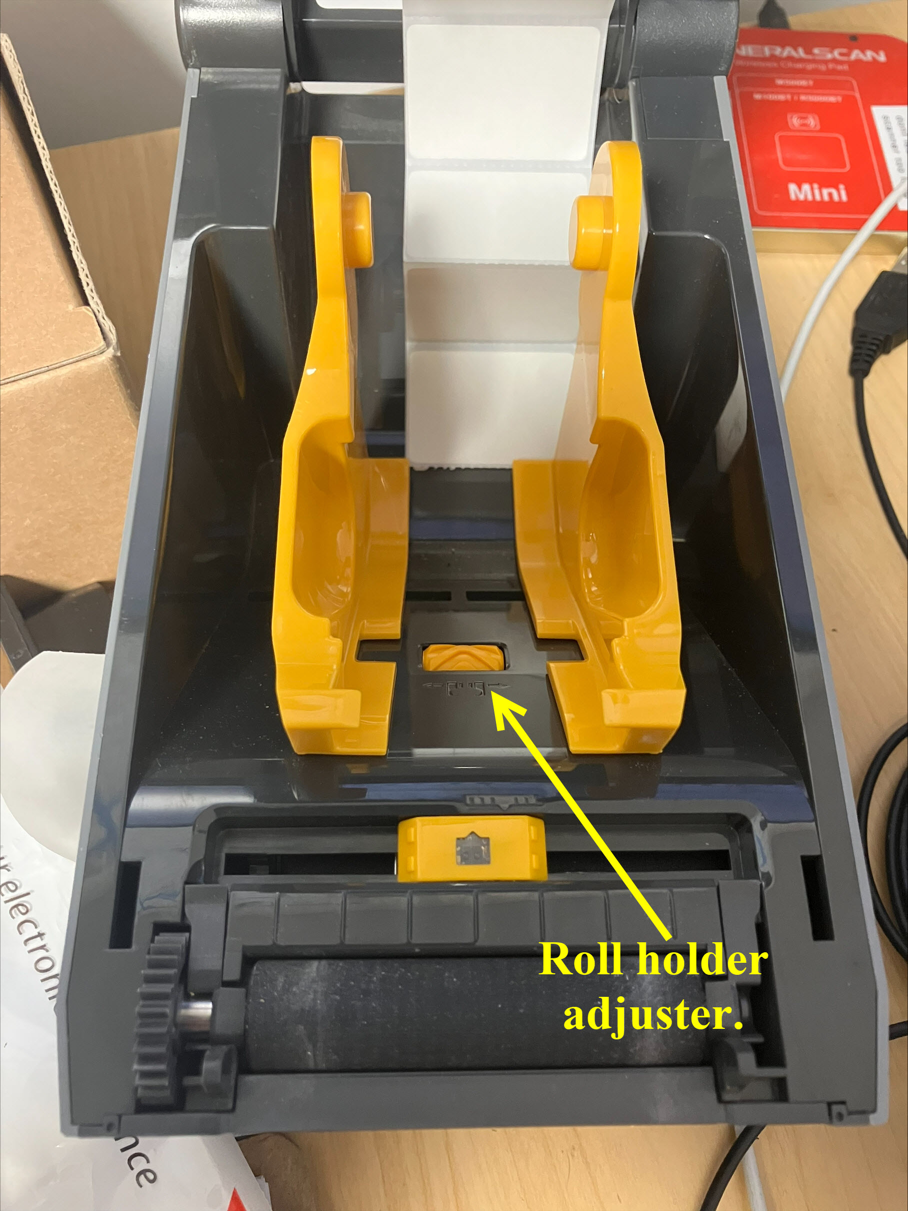 In older printers it may be a yellow roller in the middle of the label bay.